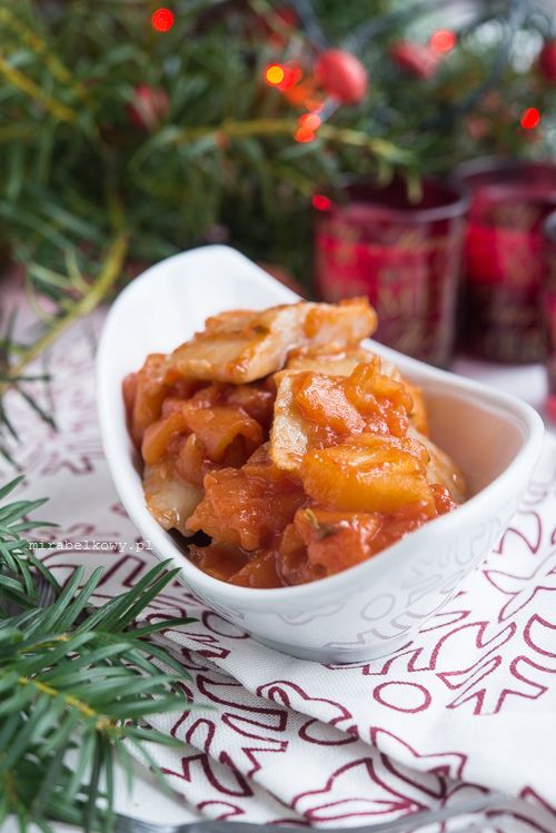 Arenques en salsa agridulce a base de manzana. Su ventaja, además del sabor, es también una pequeña cantidad de calorías en comparación con la mayoría de las recetas de arenque, que están dominadas por encurtidos a base de aceite o mayonesa. Este arenque se puede comer sin ningún remordimiento;)