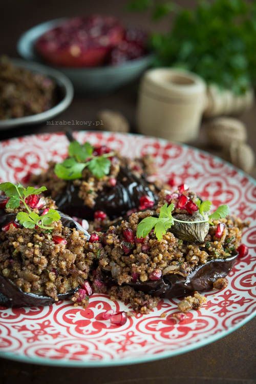 Unte una cucharada de relleno sobre cada mitad de berenjena y dóblela por la mitad. Ponga una pequeña cantidad de relleno encima y espolvoree con las semillas de granada restantes.