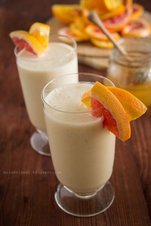 Exprime el jugo de la naranja y la toronja. Agregue miel, tahini, yogur y especias. Mezcle todo a fondo. Servir inmediatamente o enfriar en el frigorífico.