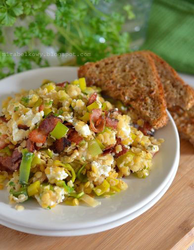 Agrega las lentejas, el tocino y el vinagre al puerro y mezcla todo bien. Condimentar con sal y pimienta. Desmenuza el queso y agrega al conjunto.