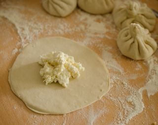 Estirar la masa espolvoreando la superficie de la mesa con harina. Cortar círculos con un diámetro de unos 15 cm (yo estaba poniendo un plato pequeño sobre la masa y recortando círculos con un cuchillo). Pon una cucharada de relleno de queso en el centro de cada disco. Forme las bolas de masa en forma de bolsa apretando con cuidado los volantes en la parte superior y girando ligeramente para crear pliegues prolijos. El extremo de cada bola de masa se puede cortar ligeramente con unas tijeras, pero esto no es necesario.