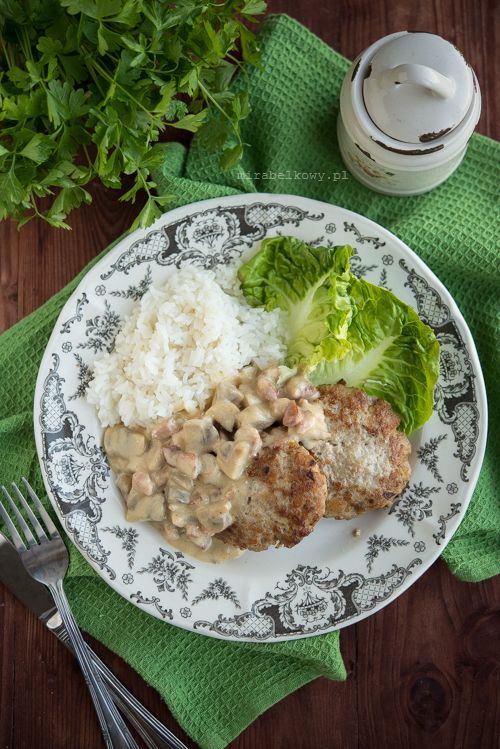 Sirve los medallones con arroz hervido, cubiertos con salsa de champiñones.