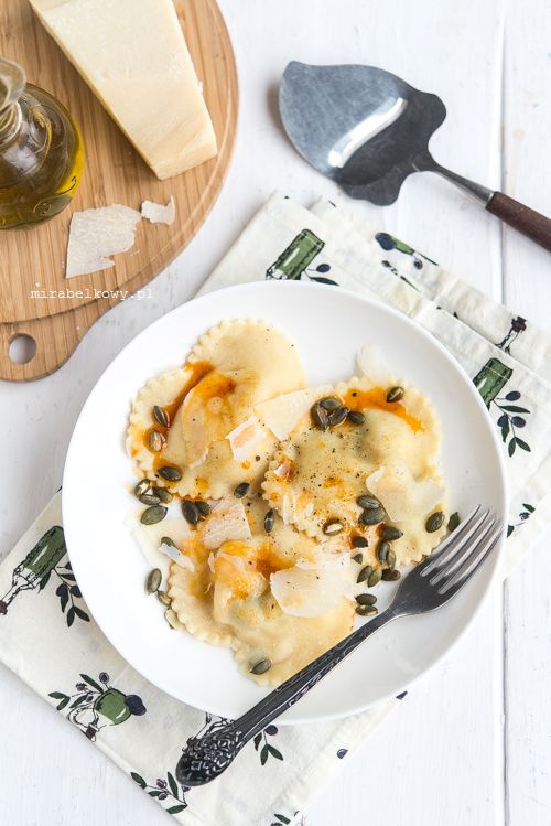 Yo, basado en esta receta, preparé ravioles rellenos de camote y queso de cabra. La dulzura de la batata se equilibra perfectamente aquí con el requesón de cabra salado, y las semillas de calabaza rompen la textura uniforme del relleno.
