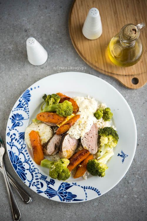 Una receta más del libro «Superalimento todos los díasJamie Oliver. Como de costumbre, no fue sin cambios; Jamie usó zanahorias pequeñas y tiernas y brócoli en rama, que no están disponibles en Polonia. Simplemente corté zanahorias comunes en trozos más pequeños y usé brócoli común. También cambié las proporciones de otros ingredientes, así que no es una receta 1: 1, solo mi interpretación. Todo sabía muy bien: la salsa de manzana y yogur combinó bien con el arroz integral y el lomo aromático 🙂