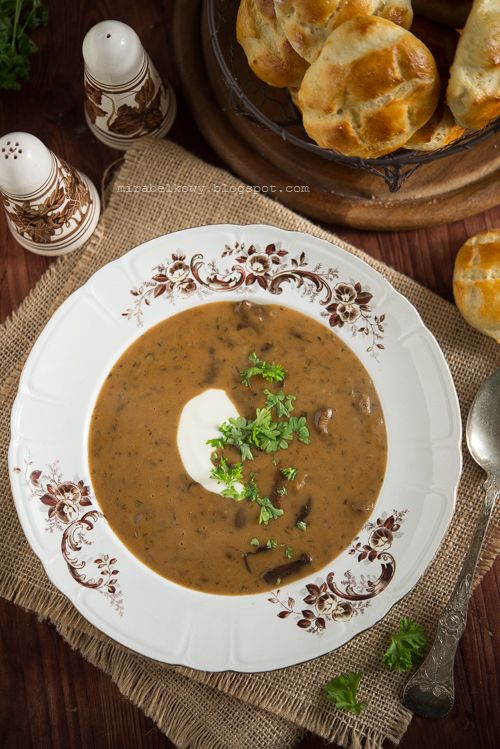 La sopa de champiñones húngara se puede servir con arroz hervido, pero la serví recién horneada. masticarque encajan perfectamente, porque podrían usarse para recoger la sopa como salsa del fondo del plato;)