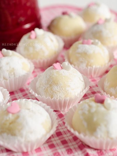 Coge la masa de chocolate blanco con una cuchara, aplana las porciones con la mano, pon una bola de rosas en el centro, cúbrela con la masa y forma bolitas. Cúbralos con azúcar glass, eventualmente decore con corazones de azúcar y póngalos en el frigorífico durante 1-2 horas.