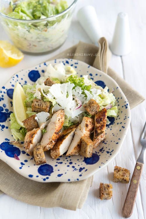 Combina la lechuga y la coliflor con el aderezo. Sirve en platos con pollo picado y picatostes.